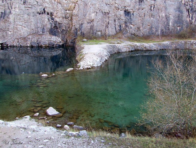 Добыча известняка в этих местах началась около 1891г. и частично прекращена в 1963г. И конечно, всё здесь в радиусе как минимум пяти километров, изгрызено добытчиками, как сыр мышами. Карьеры (какие-то до 60 метров глубиной, с синими, как море, озёрами) и карьерчики соединяются штольнями (длинна "Главной штольни" - 3 км.).