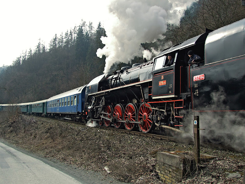 Купив билеты и мельком взглянув на уже успевший подмёрзнуть на площади народ, мы помчались обратно на станцию, посмотреть на "кривоклатский экспресс", каждый год возящий желающих на ярмарку. На этот раз экспресс возглавлял паровоз с гордым именем "Šlechtična" ("Дворянка"), 1949 г. выпуска. Ездить им особого смысла нет - билеты стоят в два раза дороже обычных, а едет это чудо медленно. Вагоны в экспрессе тоже музейные, 40-х - 50-х годов выпуска, а соответственно и сидеть два часа в пути от Праги до Кривоклата придётся на старых деревянных лавочках. Мысли о том, что эти самые деревяшки музейные, вряд ли им прибавят им мягкости. Именно из этих соображений мы вместо экспресса поехали на двух электричках с пересадкой, прибыли на полчаса раньше экспресса и встречали его на подъезде к станции.