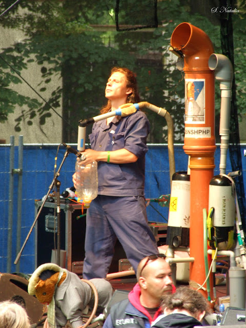 Я на некоторое время зависла в шатре напротив фолк-сцены, где можно было поваляться на подушках, попить масалу и покурить кальян. Правда, фолка на этой сцене не было замечено совсем. Среди прочих там, например, была словацкая группа, которая играет на инструментах, сделанных ими самими из найденных на помойках деталей. Если верить имеющемуся описанию, то играют они в стиле "промышленный фолк", поют о работе, и о технике безопасности. Но в силу не очень хорошего звука на сцене, и того, что пели (и, похоже, говорили тоже) они по-словацки, знакомых слов я обнаружила мало.